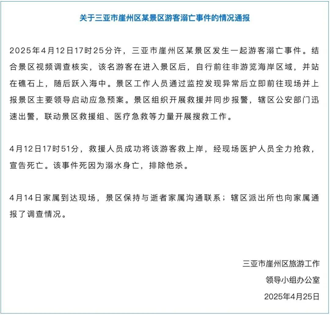 2025年4月12日17时25分许,三亚市崖州区某景区发生一起游客溺亡事件。结合景区视频调查核实,该名游客在进入景区后,自行前往非游览海岸区域,并站在礁石上,随后跃入海中。景区工作人员通过监控发现异常后立即前往现场并上报景区主要领导启动应急预案。景区组织开展救援并同步报警,辖区公安部门迅速出警,联动景区救援组、医疗急救等力量开展搜救工作。